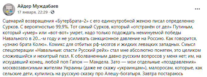 "Сценарий возвращения "БутерБрата–2" с его единоутробной женою писал определенно Сурков. С вероятностью 99,9%. Тот самый Сурков, который "отстранён от дел" Путиным, который "умер" или "вот-вот" умрет, надо только подождать неминуемой победы Навального в 20...-м году и не усиливать санкционное давление на Россию. Как говорится, "узнаю брата Колю". Комикс для отбитых рф-мозгов и жидких левацких западных. Смысл спецоперации "Навальные: спасти Русский рейх" стал мне абсолютно понятен, это целиком сложившийся и нехитрый пазл. К оболваненным давно русским вопросов у меня нет; им, на исхудавший конец, любой поп Гапон — Мандела. Зато — мои отдельные "поздравления" москвозависимым жителям Украины (даже не скажу "украинцам"), малоросам, которые, как сельские дети, купились на русскую сказку про Алешу-богатыря", - пишет Муждабаев.