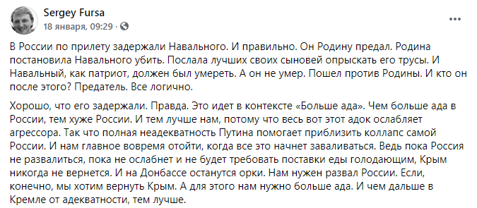 Ведь пока Россия не развалиться, пока не ослабнет и не будет требовать поставки еды голодающим, Крым никогда не вернется. И на Донбассе останутся орки. Нам нужен развал России. Если, конечно, мы хотим вернуть Крым. А для этого нам нужно больше ада. И чем дальше в Кремле от адекватности, тем лучше".