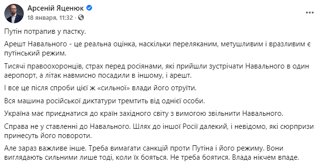 Арсений Яценюк написал примерно то же самое - "Украина должна присоединиться к странам западного мира с требованием освободить Навального". И заявил, что теперь "машина российской диктатуры дрожит от одного человека".