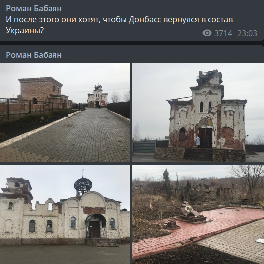 Бабаян также показал фото из неподконтрольного Донбасса с разрушенным от обстрелов Иверским монастырем близ Донецкого аэропорта и задался вопросом: "И после этого они хотят, чтобы Донбасс вернулся в состав Украины?"