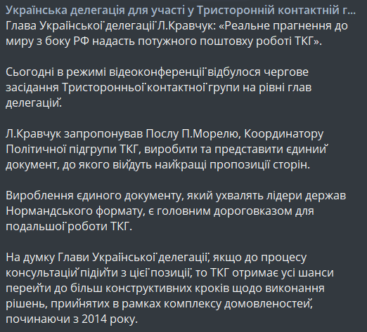 Впрочем, в итоговом заявлении украинской делегации данного факта не содержится. Но говорится, что Кравчук предложил главе политической подгруппы Морелю самому "выработать и представить единый документ, в который войдут лучшие предложения сторон".
