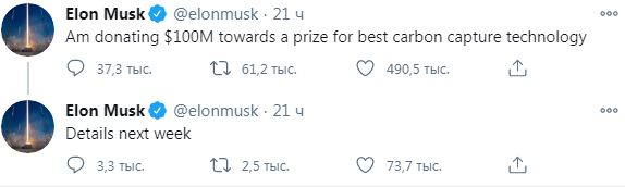 "Я пожертвую 100 миллионов долларов в качестве приза за лучшую технологию улавливания углерода", - написал Маск. Также он пообещал раскрыть подробности предложения на следующей неделе.