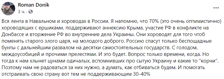 Волонтер Роман Доник считает, что протестующие за Навального поддерживают аннексию Крыма, а Украину устроят лишь "беспощадные бунты" и развал России. После которого, как рассуждает Доник, Украина поможет отстроить "разрушенную Россию".