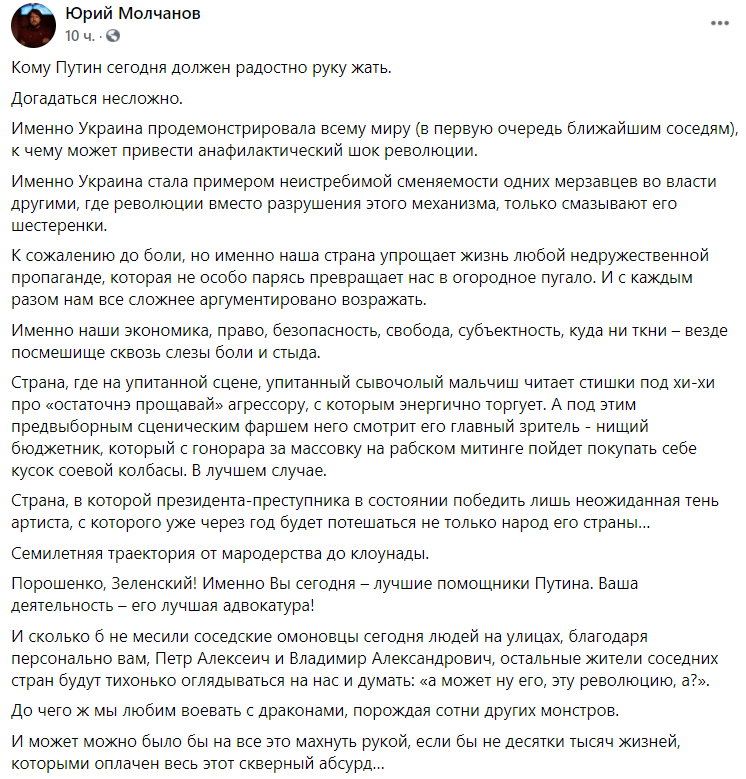 Порошенко, Зеленский! Именно Вы сегодня – лучшие помощники Путина. Ваша деятельность – его лучшая адвокатура!