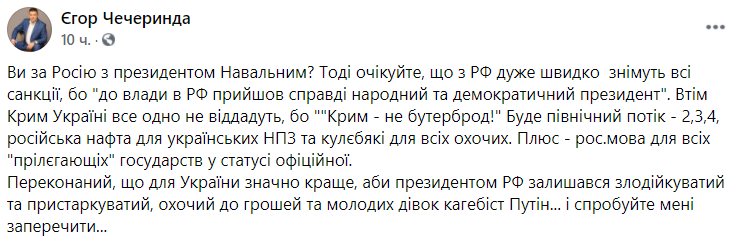 "Вы за Россию с президентом Навальным? Тогда ждите, что с РФ очень быстро снимут все санкции, поскольку "к власти в РФ пришел действительно народный и демократический президент". Впрочем Крым Украине все равно не отдадут, потому что "Крым - не бутерброд!"