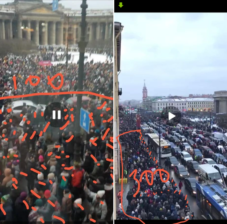 Вот на этих картинках из Питера ниже я посчитал по головам. Если округлить, то на одной будет 300. Вот так вот выглядит 300 человек. Запомните. И на другом ракурсе толпы - вот так выглядят 100. И теперь с этими знаниями можно оценить, что в Питере было с очень большой натяжкой тысяч 5. То же самое в Москве, но давайте тоже округлим и возьмём самый оптимистичный подсчёт и согласимся, что было тысяч 10-15, на 10-15 миллионный город, окей. Кроме Питера и Москвы крупные митинги были во Владивостоке и Екатеринбурге по пару тысяч. Во всех остальных городах - по пару сотен, до тысячи. А также есть масса городов, в которых вообще ничего не происходило.