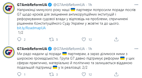 Послы стран "Большой семерки" (G7) представили дорожную карту по реформам судебной власти и антикоррупционных органов в Украине.