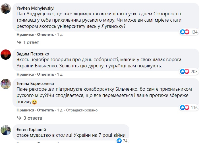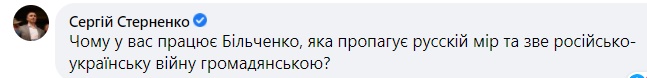 Как видим, на ниве онлайн-травли - все тот же радикал Стерненко, который чуть ли не под каждым постом педуниверситета Драгоманова пишет однотипную фразу: "Почему у вас работает Бильченко, которая пропагандирует русский мир и называет российско-украинскую войну гражданской?".