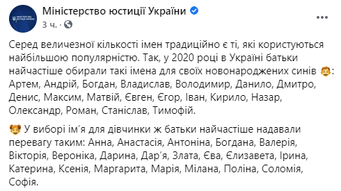 В 2020 году в Украине родители чаще всего выбирали такие имена для своих новорожденных сыновей: Артем, Андрей, Богдан, Владислав, Владимир, Даниил, Дмитрий, Денис, Максим, Матвей, Евгений, Егор, Иван, Кирилл, Назар, Александр, Роман, Станислав, Тимофей.