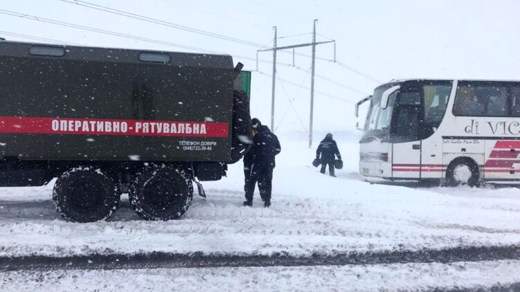 "Наблюдаются снежные заносы протяженностью около 30 км, в которых заблокировано до 300 крупногабаритных транспортных средств, движение в направлении Киева закрыто", - сообщили спасатели.