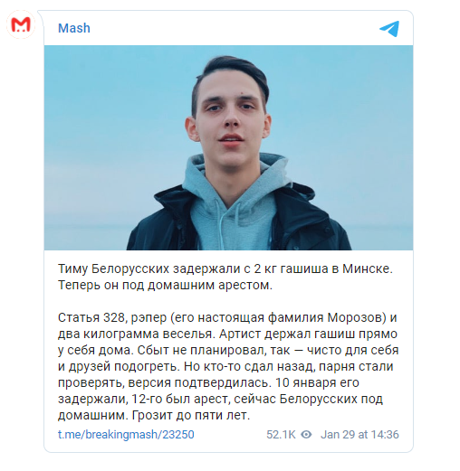 "Статья 328, рэпер (его настоящая фамилия Морозов) и два килограмма веселья. Артист держал гашиш прямо у себя дома. Сбыт не планировал, так - чисто для себя и друзей подогреть. Но кто-то сдал назад, парня стали проверять, версия подтвердилась. 10 января его задержали, 12-го был арест, сейчас Белорусских под домашним. Грозит до пяти лет", - говорится в сообщении.