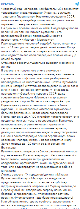"В предисловии к книге Михаила Булгакова "Мастер и Маргарита" упоминаются представители российского кино, которые за публичную поддержку военной интервенции в Украине внесены в Перечень лиц, которые создают угрозу национальной безопасности", - пояснил Олейник.