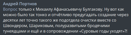 "Вопрос только к Михаилу Афанасьевичу Булгакову. Ну, вот как можно было так тонко и отчётливо предугадать создание через десятки лет точно такого же подотдела очистки вместе со Швондером, Шариковым, полуразвитыми бродячими тунеядцами и ещё и в сопровождении "Суровые годы уходят"?!".