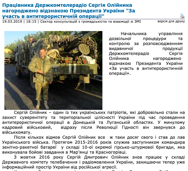 19 марта 2019 года на сайте Госкомтелерадио появилась еще одна заметка. В ней говорилось о том, что тогдашний президент Петр Порошенко наградил Сергей Олийныка, бывшего кадрового военного, который пошел добровольцем в АТО знаком отличия "За участие в Антитеррористической операции" .