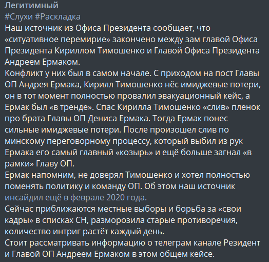 Также происками Кремля, видимо, сочли аналитику о взаимоотношениях Кирилла Тимошенко и главы Офиса президента Андрея Ермака.