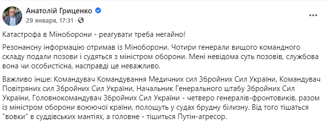 "Резонансную информацию получил из Минобороны. Четыре генерала высшего командного состава подали иски и судятся с министром обороны. Мне неизвестна суть исков, служебная она или личностная", - написал Гриценко в Фейсбуке.