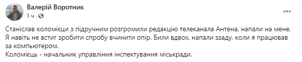 В свою очередь сам пострадавший журналист на своей странице в соцсети сообщил подробности нападения. По его словам в редакцию ворвался начальник управления инспекции Черкасского горсовета Станислав Коломиец и его подручный.