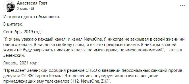 "Президент Зеленский одобрил решение СНБО о введении персональных санкций против депутата ОПЗЖ Тараса Козака. Это решение аннулирует лицензии на вещание принадлежащих ему телеканалов (112, NewsOne, ZIK)".