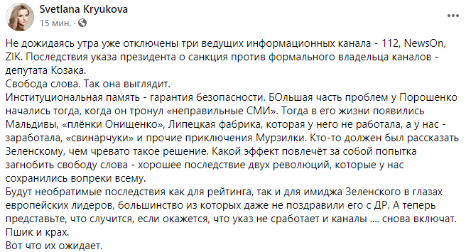 "Таким решением власть выходит за рамки правового поля. Ответственность для СМИ должна наступать вследствие законных действий, с использованием права на защиту, вследствие дебатов по решению медиарегуляторов. Тут внесудебным способом происходит блокирование телеканалов, СМИ с огромной аудиторией, при чем это те СМИ, куда до последнего приходили представители власти, "Слуги народа", то есть, даже таким образом они подтверждали, что взаимодействуют с украинской аудиторией. Это наступление на свободу слова, лишение права на информацию большого числа украинцев. Это приведет к информационному взрыву и шоку международных партнеров.