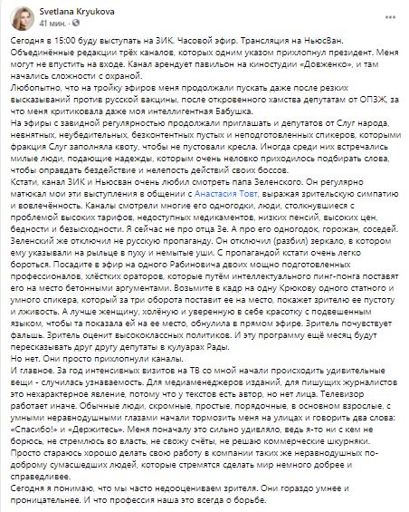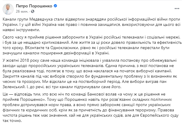 "Закрытие трех телеканалов - 112, NewsOne и Zik - это акт невиданной цензуры и очередной шаг к установлению диктатуры в Украине. Сначала они запретили местные выборы в 18 ОТГ Донбасса, лишив права голоса 500 тысяч украинцев, которые точно не проголосовали бы за эту власть. Теперь они через колено ломают свободу слова в Украине, решив закрыть три телеканала, в объективности которых они видят угрозу остаткам своих рейтингов. Они подписали решение не о закрытии телеканалов, а приговор самим себе. Еще никто в мире не победил в борьбе со свободой слова и журналистами. Многомиллионная аудитория телеканалов, как и миллионы граждан нашей страны, несомненно по достоинству оценят это решение зе-власти, доверия к которой и так уже не осталось".