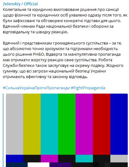 "Против Украины ведется гибридная война в том числе и на информационном поле. Мы системно должны ей противодействовать, чтобы защитить интересы государства. Введение санкций - еще один важный и последовательный шаг для этого. Поэтому, учитывая данные, которыми располагает Служба безопасности, а также многочисленные нарушения законодательства в сфере телерадиовещания, зафиксированные Национальным советом Украины по вопросам телевидения и радиовещания, СБУ предоставила обоснованные рекомендации СНБО принять соответствующее решение ", - отметил Иван Баканов.