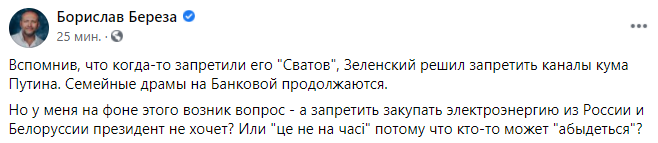 Но у меня на фоне этого возник вопрос - а запретить закупать электроэнергию из России и Белоруссии президент не хочет? Или "це не на часі" потому что кто-то может "абыдеться"?", - пишет экс-депутат Борислав Береза.