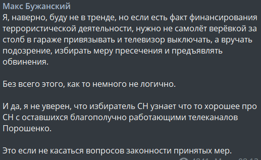 "Я считаю, что мы живем в стране, где идет война, в том числе гибридная и информационная... Но если мы говорим о санкциях, то их мы вводим в отношении тех, кого мы не можем наказать здесь. Это иностранные государства и хозсубьекты... Если мы говорим о терроризме, или эти люди помогают финансово "ДНР-ЛНР" или стране агрессору, то тут должно быть подозрение. И украинский суд должен принять решение, есть или нет".