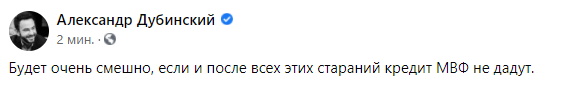 09:04 "Будет очень смешно, если и после всех этих стараний кредит МВФ не дадут", - пишет недавно исключенный из "Слуги народа" нардеп Александр Дубинский.