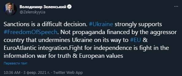 "Хотя усилия Украины по защите своей территориальной целостности и национальной безопасности, а также по защите от манипуляций информацией являются законными, в частности, с учетом масштабов дезинформационных кампаний, затрагивающих Украину, в том числе из-за рубежа, это не должно происходить за счет свободы СМИ и должно осуществляться при полном уважении основных прав и свобод и в соответствии с международными стандартами", - заявил представитель Внешней дипломатической службы Питер Стан.