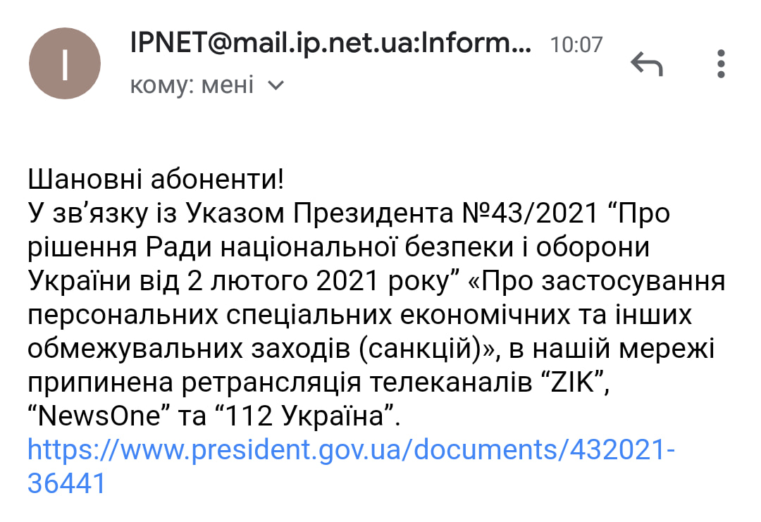 10:21 Провайдеры начали рассылать украинцам письма о блокировке NewsOne, Zik и 112. Там говорится, что это сделано согласно указу президента.