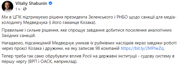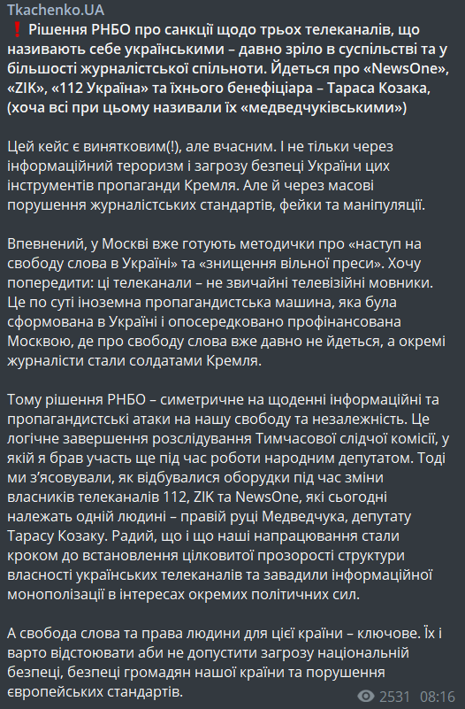 "Владимир Зеленский ввел санкции против телеканалов "112 Украина", NewsOne и ZIK. Это решение является абсолютно незаконным, поскольку согласно части второй статьи 1 Закона Украины "О санкциях", они "могут применяться со стороны Украины в отношении иностранного государства, иностранного юридического лица, юридического лица, находящегося под контролем иностранного юридического лица или физического лица-нерезидента, иностранцев, лиц без гражданства…", а народный депутат Тарас Козак – гражданин Украины, и телеканалы "112 Украина", NewsOne, ZIK являются украинскими юридическими лицами.