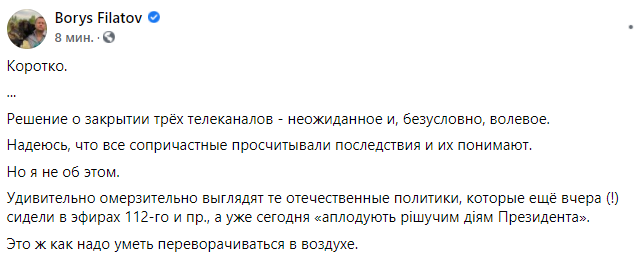 08:59 Мэр Днепра Борис Филатов: "Удивительно омерзительно выглядят те отечественные политики, которые ещё вчера (!) сидели в эфирах 112-го и пр., а уже сегодня "аплодують рішучим діям Президента".
