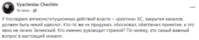 "У последних антиконституционных действий власти – "разгона" КС, закрытия каналов, должен быть некий идеолог. Кто-то же их придумал, обосновал, обеспечил принятие, и это явно не лично Зеленский. Кто именно руководит страной? По-моему, это самый важный вопрос в настоящий момент".