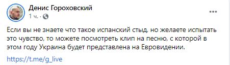 "Если вы не знаете, что такое испанский стыд, но желаете испытать это чувство, то можете посмотреть клип на песню, с которой в этом году Украина будет представлена на Евровидении", - написал блогер Денис Гороховский.