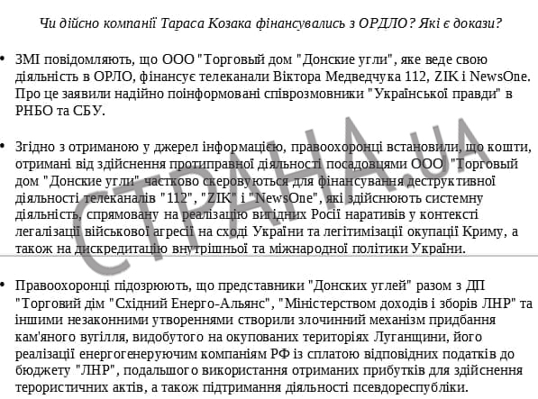 Депутатам предлагается говорить, что закрытые телеканалы "могли финансироваться государством-агрессором через схемы на оккупированной территории и могли контролироваться из России". И тут в методичке всплывает анонимный вброс из российских телеграм-каналов о компании "Донские угли", которая якобы вывозит уголь из "ДНР" и "ЛНР". Ее, мол, контролирует Медведчук.