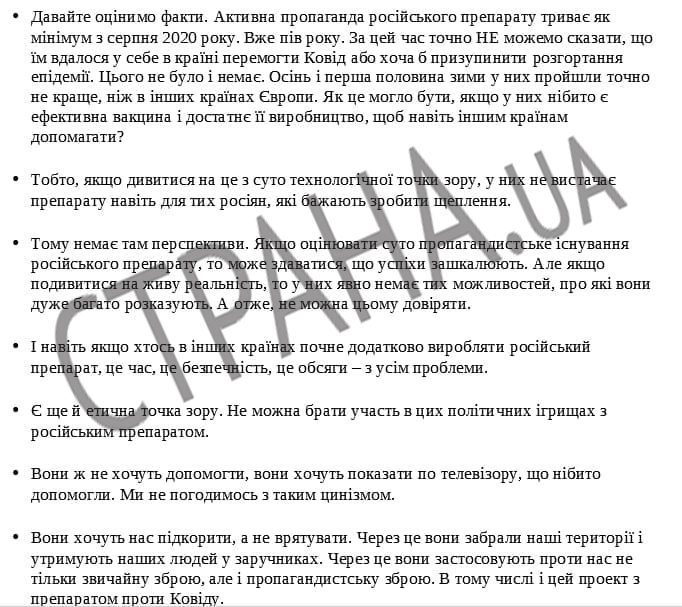 Очень интересные аргументы предлагаются нардепам по поводу российской вакцины "Спутник V". Они должны отстаивать ее "неликвидность" следующими заявлениями: