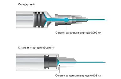 При этом выяснилось, что использовать максимальный объем вакцины можно, используя только специальные шприцы с так называемым малым "мертвым объемом". То есть в них остается меньшее количество не введенного препарата.