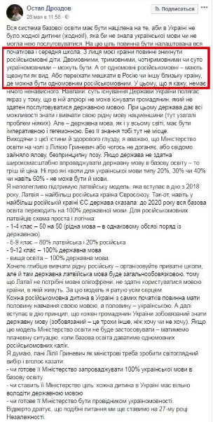 "Вся система базового образования должна быть нацелена на то, чтобы в Украине не было ни одного ребенка (ни одного!), который бы не знал украинского языка или не мог бы им пользоваться. На эту цель должна быть настроена вся начальная и средняя школа. С лица моей страны должны исчезнуть русскоязычные дети. Двуязычными, трехъязычными, четырехъязычными или чисто украиноязычными – могут быть. А вот одноязычные русскоязычные – должны исчезнуть как вид. Или переехать жить в Россию или другую близкую страну, где можно быть одноязычным русскоязычным", – написал он.