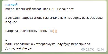 "Вчера Зеленский сказал, что НАШ не закроет, а сегодня нацрада снова назначила нам проверку из-за Азарова в эфире. Нацрада Зеленского, напомню. Пані Герасимюк, а четвертому каналу буде перевірка за Дроздова? Дякую", – написал Назаров.