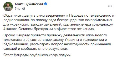 "Обратился с депутатским зверненням к Нацраде по телевидению и радиовещанию, по поводу ряда беспрецедентно оскорбительных для украинских граждан заявлений, сделанных вчера сотрудником 4 канала Остапом Дроздовым в эфире этого же канала.