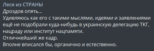 "Удивляюсь, как его с такими мыслями, идеями и заявлениями еще не подобрали куда-нибудь в украинскую делегацию ТКГ, нацраду или институт нацпамяти.