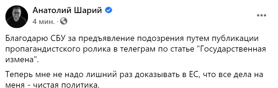 Шарий уже отреагировал на произошедшее: "Благодарю СБУ за предъявление подозрения путем публикации пропагандистского ролика в телеграм по статье "Государственная измена". Теперь мне не надо лишний раз доказывать в ЕС, что все дела на меня - чистая политика", - написал он в соцсети.