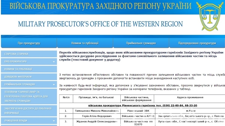 "Перечень военнослужащих, касательно которых военными прокуратурами гарнизонов Западного региона Украины совершается досудебное расследование по фактам самовольного оставления военных частей и мест службы", - сказано на сайте ведомства.