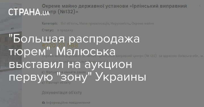 Министр юстиции Украины Денис Малюська объявил о том, что на аукцион выставлена первая украинская тюрьма. Таким учреждением в Украине стал Ирпенский исправительный центр (№132), который находится в поселке Коцюбинское Киевской области.