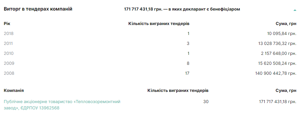 В декларации Кичуна указана сумма в 171 миллионов 717 431 гривен и 18 копеек, которую он получил как бенефициар публичного акционерного общества "Тепловозоремонтний завод". Частью акций этой компании владеет его супруга - Елена Кичун. Тендеры проводились в 2008, 2009, 2010, 2011 и 2018 годах.