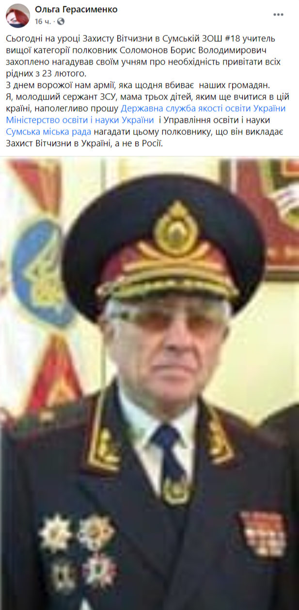 Герасименко написала, что является младшим сержантом ВСУ, мамой троих детей, "которым еще учиться в этой стране", и настойчиво попросила Государственную службу качества образования, Министерство образования  и гороно "напомнить полковнику, что он преподает Защиту Отечества в Украине, а не в России".