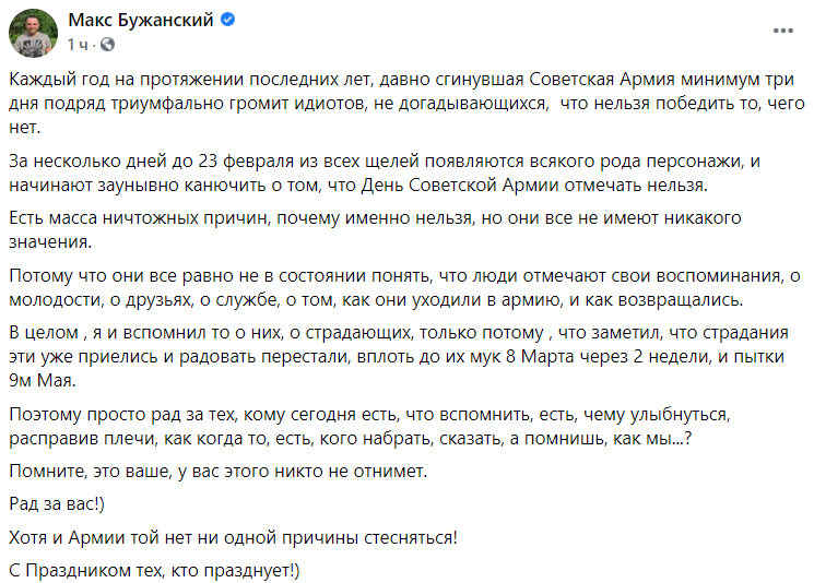 Нардеп Максим Бужанский полемизирует с теми, кто критикует отмечание 23 февраля.