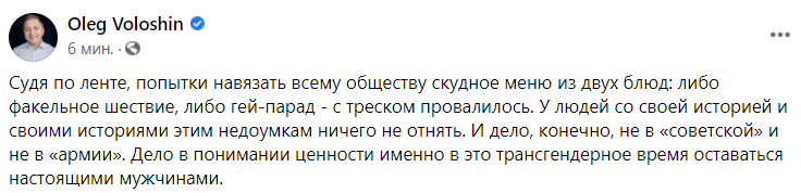 "Судя по ленте, попытки навязать всему обществу скудное меню из двух блюд: либо факельное шествие, либо гей-парад - с треском провалилось. У людей со своей историей и своими историями этим недоумкам ничего не отнять. И дело, конечно, не в "советской" и не в "армии". Дело в понимании ценности именно в это трансгендерное время оставаться настоящими мужчинами".