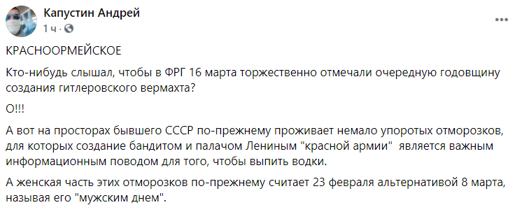 За несколько дней до 23 февраля из всех щелей появляются всякого рода персонажи, и начинают заунывно канючить о том, что День Советской Армии отмечать нельзя.