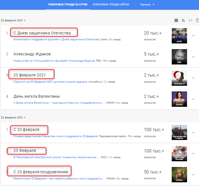 Это видно прежде всего по украинским трендам Google. Запросы, связанные с бывшим днем защитника отечества начали расти еще вчера. Фраза "С 23 февраля" возглавила поисковый топ за понедельник, а другой похожий запрос лидирует уже во вторник с утра.